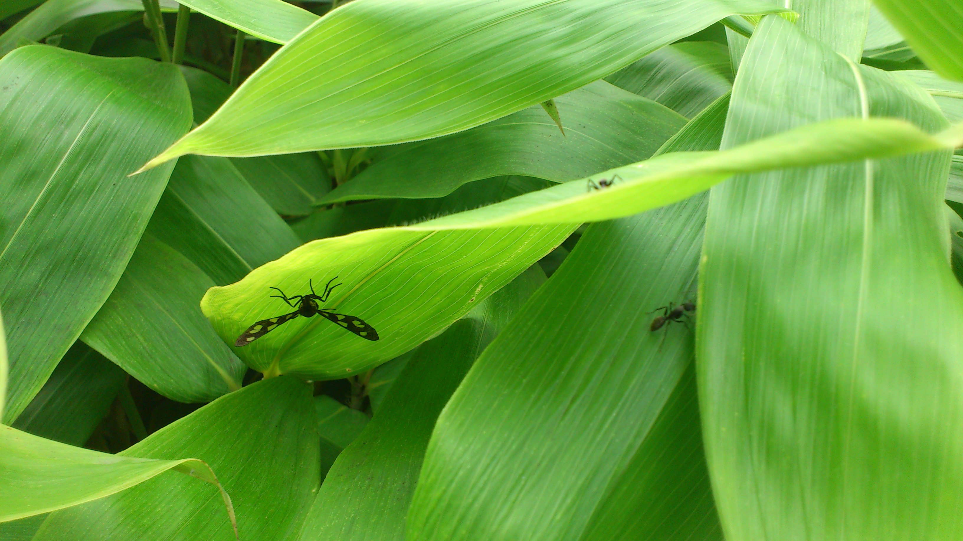 日差しを避けるように、カノコガは笹の葉影でじっと休んでいます。