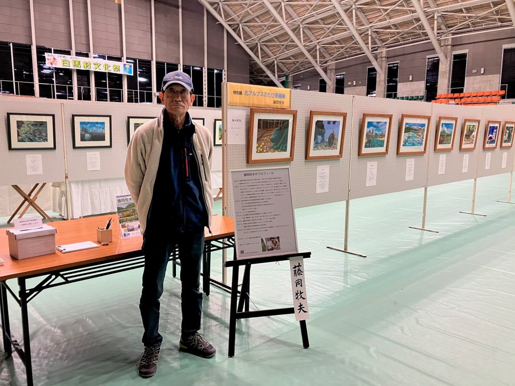 白馬村協和ウイング体育館で年に一回の文化祭の期間中、会場の一部をお借りして原画展が開催されました。その時の様子でお天気も良く初日は白馬三山が見事な初冠雪でした。文化祭は大変盛況でさすが白馬村は国際色豊かでした。村の行事では運動会と文化祭が2大イベントで、そして冬場は観光客が多く押し寄せる訳が納得のロケーションでした。原画展を開催してくださった村長さんはじめ関係者の皆さまありがとうございました。