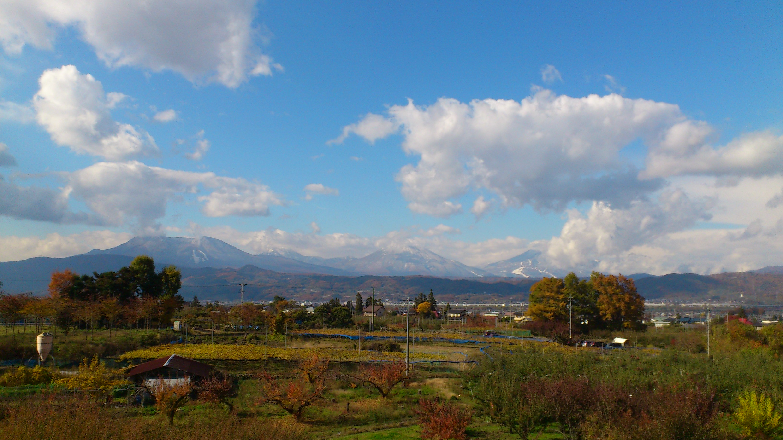 西側の雲が去っていくと、スキー場のゲレンデ部分が真っ白になった飯縄山、黒姫山、妙高山が見えてきました。