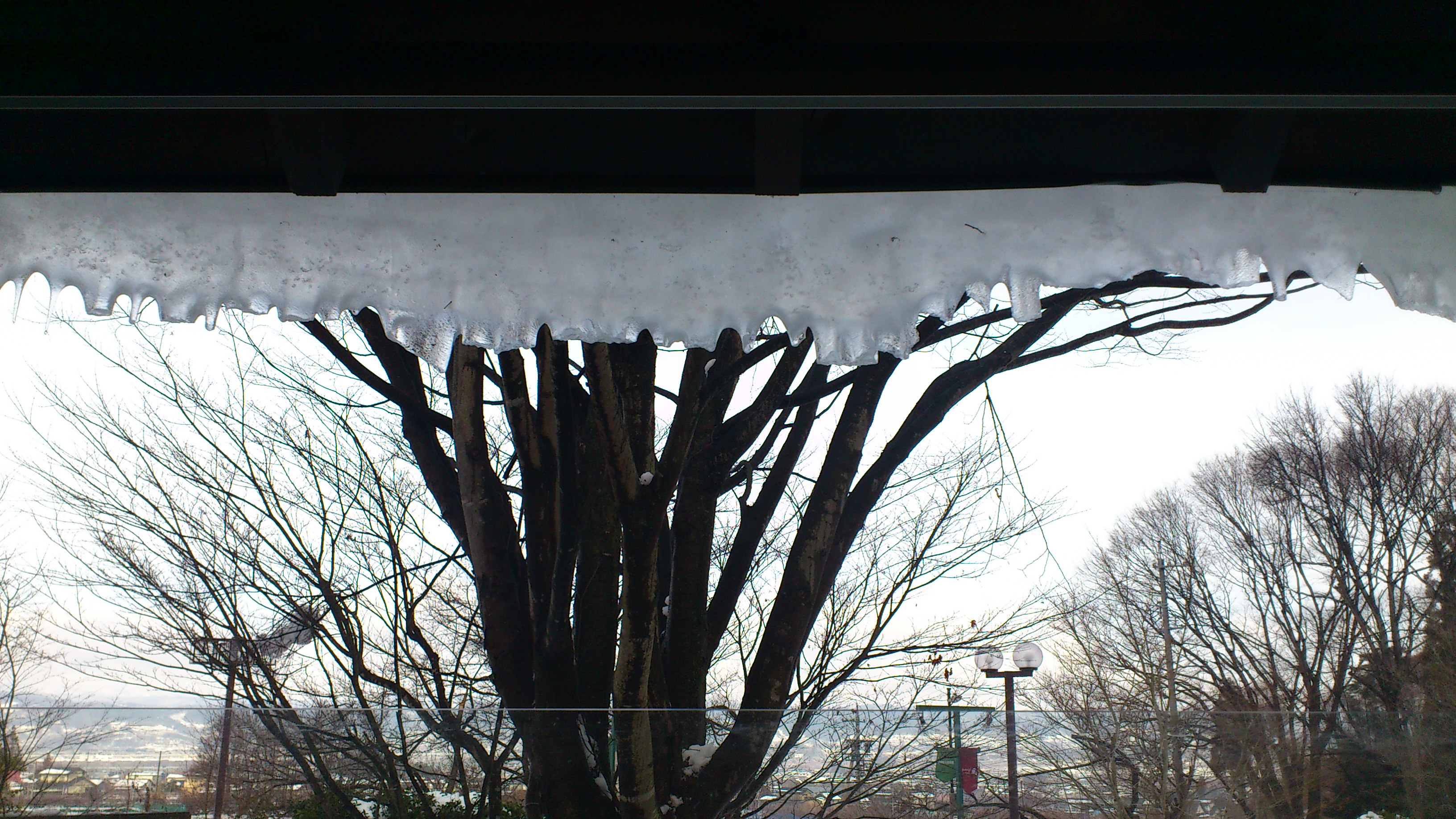 きのうから冷え込みが緩んだため、見事な出来栄えだったつららは全部落ちてしまい、下には残骸が散らばっておりました。