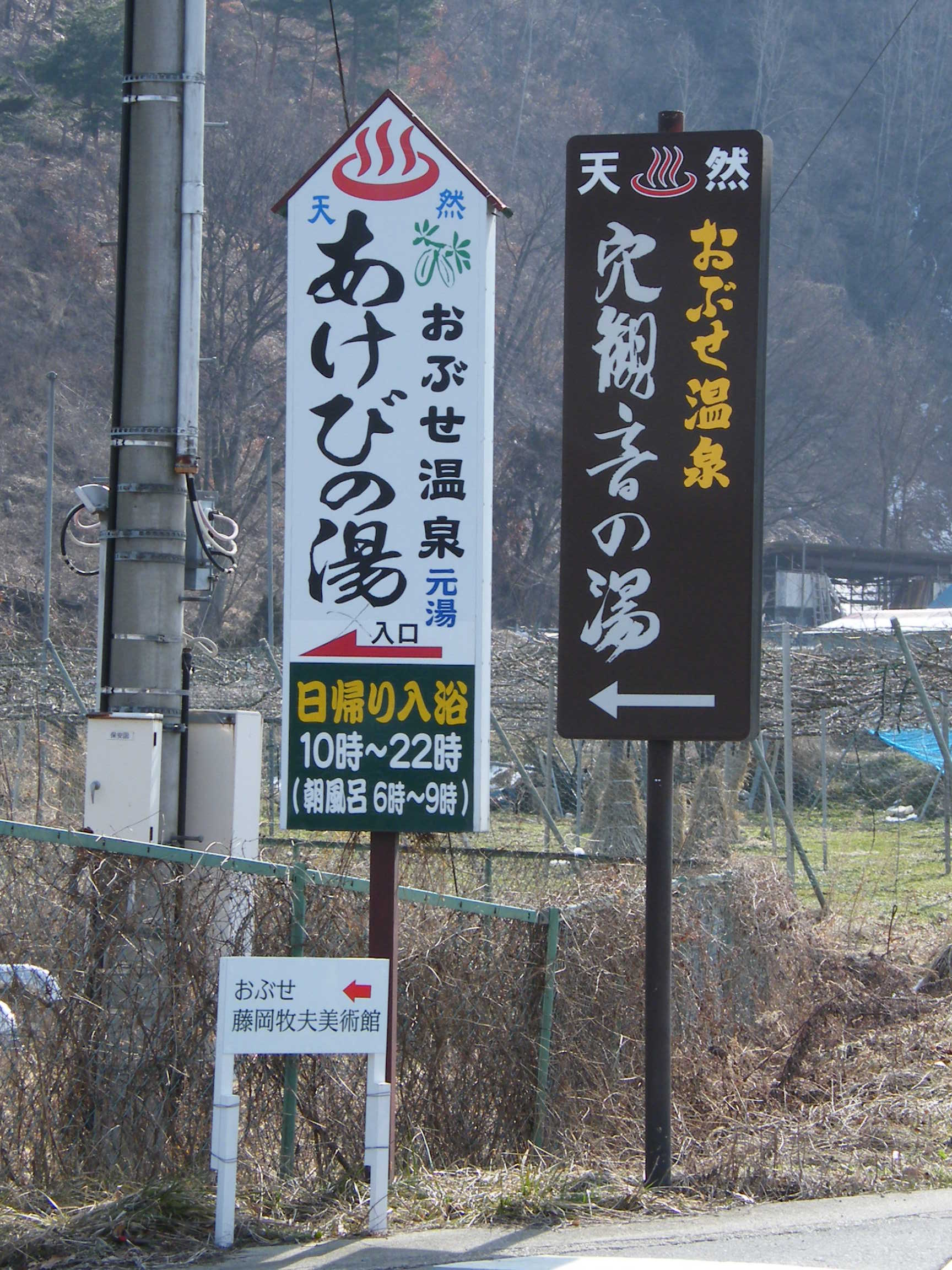 北信濃くだもの街道「雁田」の信号を高山村方面に進んでいただきしばらくすると、左手に小布施温泉の縦型の看板が2つあります。