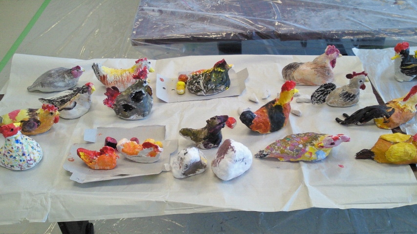 ニワトリの粘土細工作りに取り組んだ子どもたちは25名、父兄の方々も手を出し口を出し、思い思いに個性的な作品を作り上げました。
