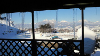 きょうの朝は-10度にもなり日の出から雲一つない快晴になりました。除雪が進まない道路はカチン、コチンのデコボコ道です。命の惜しい車は車間距離を取り、ゆっくり進んで行きます。そうでない車はそんな道でもスピードを上げて走ります。やっと着いて振り返れば、見事な北信五岳が見渡せるのでした。今年はとても雪が多い(駐車場はきれいに除雪できてます。)のですが美術館にいらして下さい。この景色、生でお見せしたいです。