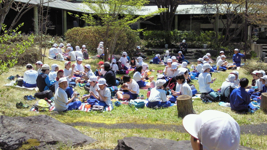今日は良く晴れ渡って、北信五岳、噴煙を休止している焼山、北アルプスもはっきりと雪山が望め、風も爽やか遠足日和でした。高山小学校5年生70名の皆さんようこそ美術館にいらっしゃいました。浄光寺のスラックラインを体験して、美術館で空想かき立てる絵を鑑賞して、ウグイスが鳴り響く庭でおいしいお弁当を食べて充実した一日でしたね。帰りも2時間かけて、しかも上り坂を帰るということです。気を付けてお帰りなさい!ありがとうございました。