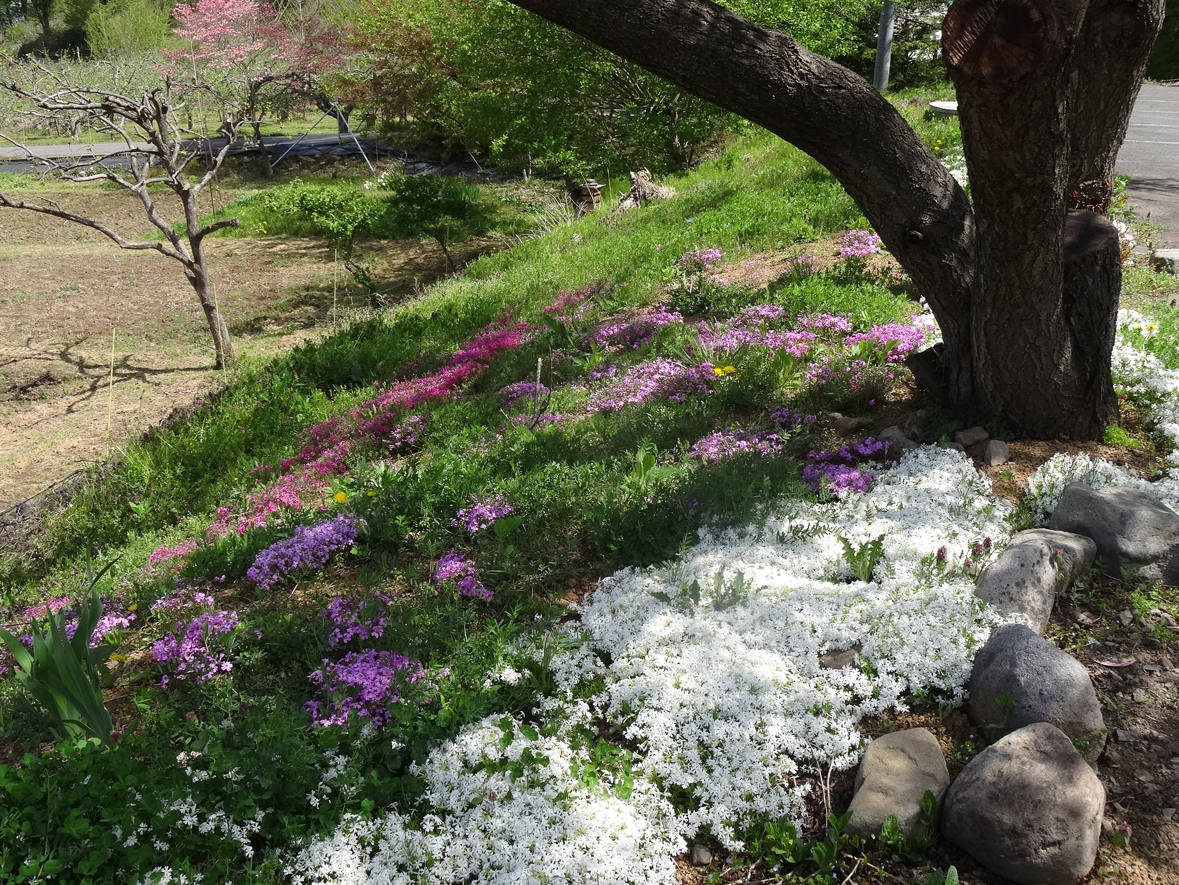 昨年新しくサポーター制度が出来、その中の活動の一つとして、美術館駐車場北側、魯桃桜の下にたくさんの芝桜を植えていただきました。嬉しいことに、物すごい雑草にもめげなかった白やピンクの可愛らしい芝桜が見事に咲きました。(下記の写真)うっとりしている時間もなく、雑草たちはどんどん横に縦に伸びる伸びる。ここでサポーターの皆様にひと月遅れの草取りをしていただきました。あまりの雑草に愚痴も言わず、黙々と取ってくださる皆様の姿に頭が下がりました。只々こちらの準備不足で来ていただくのが遅かったのでした。さらに穴観音温泉の下、温泉から美術館までの広く長い散策コースをビーバーで刈って下さった方、これも大助かりでした。サポーターの皆様、本当にありがとうございました!