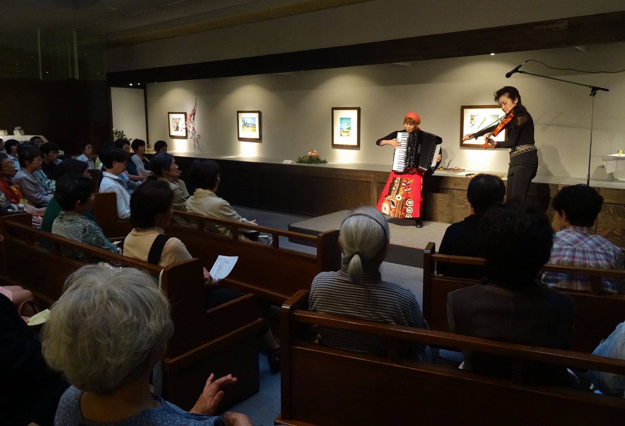 きょうはシャワーの会」さんの15周年記念コンサートが美術館常設展示室で開催されました。演奏者はTENGO、天野紀子さんのヴァイオリンと後藤ミホコさんのアコーディオンデュオです。クラシック、タンゴ、ロシアの音楽、日本の音楽、様々なジャンルの素晴らしい演奏をお聴かせいただきました。
