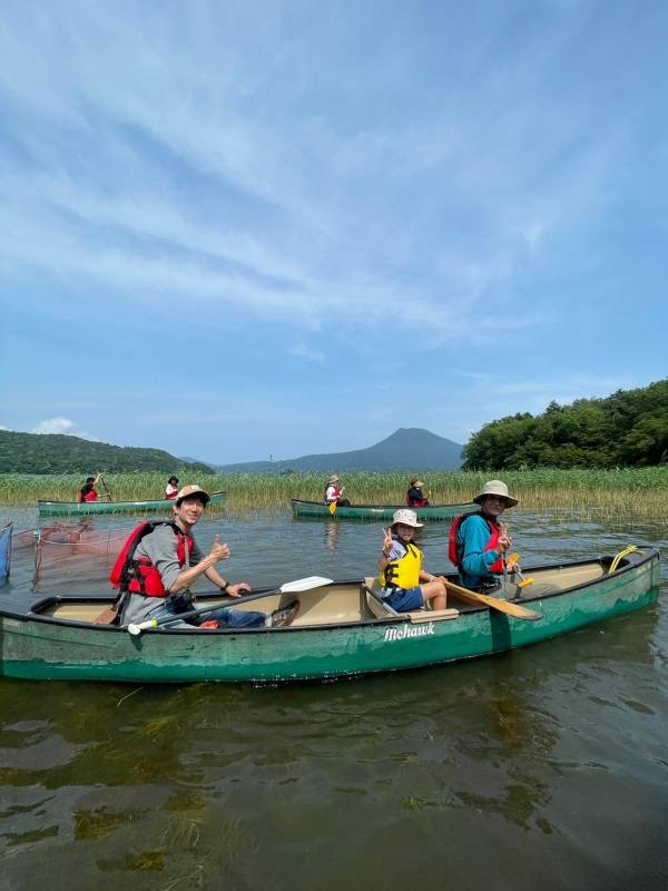 孫娘の初めてのカヌーに息子と付き合い阿寒湖の湖面は心地よく親子三代良い記念になりました。