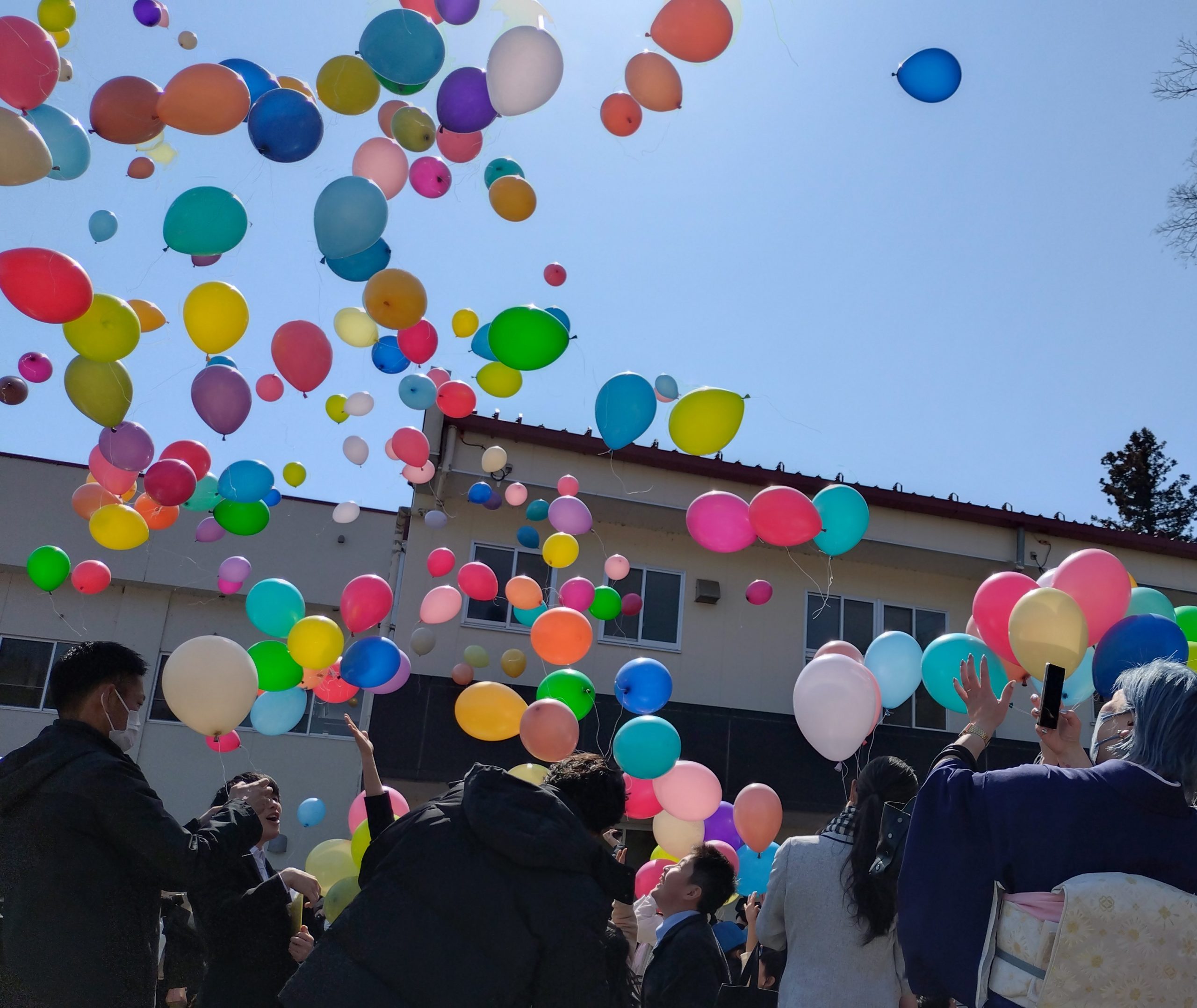 2024年3月19日 / 最終更新日時 : 2024年3月19日 藤岡美鈴 日々のスケッチ 小学校の閉校式 去る16日は10年前から交流のあった長野市立信更小学校で閉校式が行われました。この小学校は生徒数14名です。今年の卒業生はたったの3人で今年度で閉校になります。その式に呼ばれた藤岡です。最後の卒業式と校旗の返却式があり悲しい場面でした。「おめでとうございます。」とは言いにくく修了式、卒業式、閉校式の最後には色とりどりの風船が青空に吸い込まれていきました。 子どもたちと一緒に描いた大きな絵は階段の壁に飾られていたけれどもう見てくれる人はいないと思うと さみしい限りです。14名のみんな新しい学校でも元気でね。