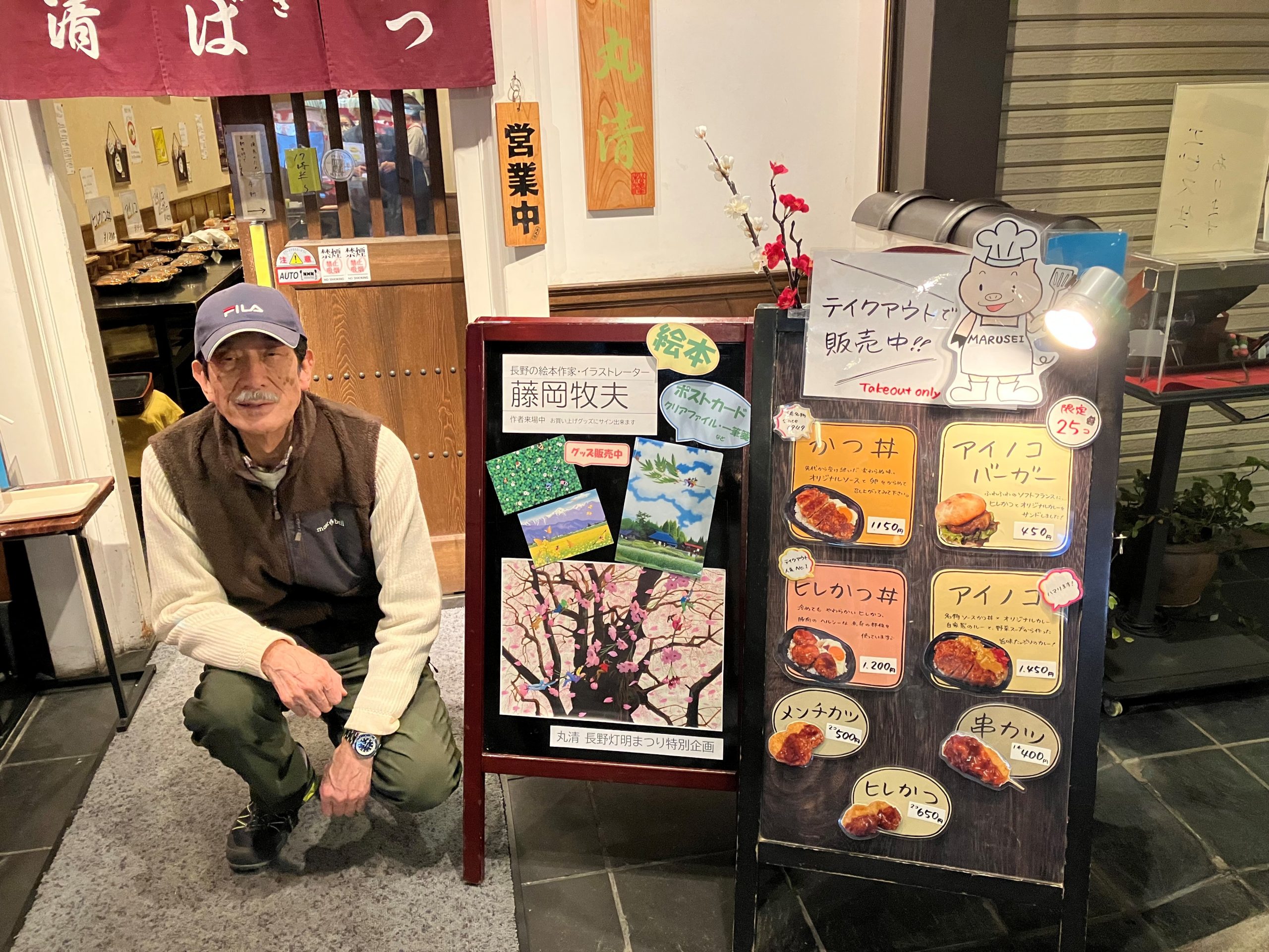 今年で22回目の長野灯明まつりに善光寺仲店商店街で、お蕎麦・豚カツ屋の「丸清」さんが藤岡のためにお店の一画を貸してくださいました。はがきや小さなグッズ販売をしています。